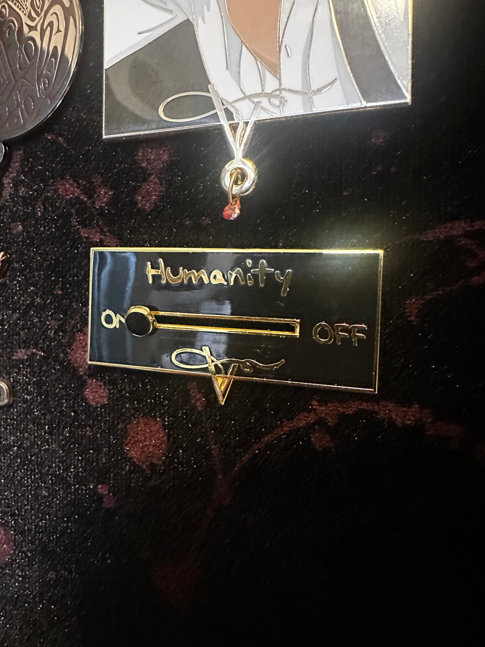 2” hard enamel pin featuring the ability to turn your humanity on or off! Plated in gold metal and two pin posts.